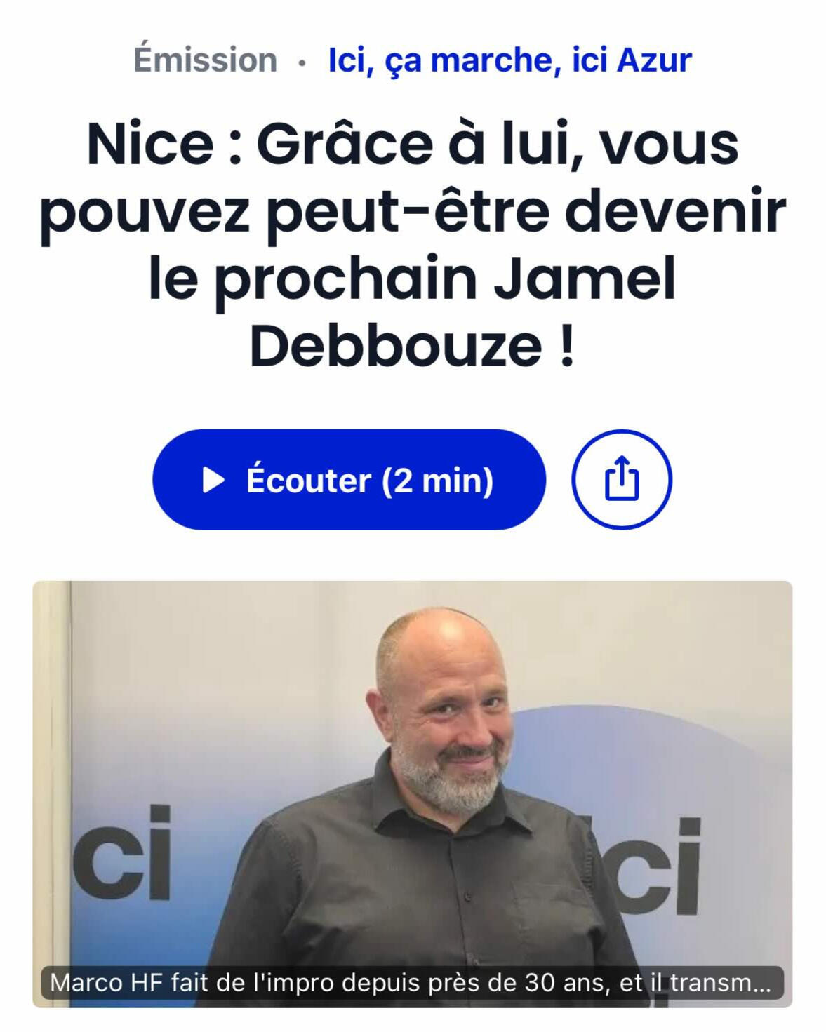 Marco est un comédien français. Il pratique et enseigne le théâtre d’improvisation depuis près de 30 ans. Il débute sa carrière à Trappes au sein de la Cie Déclic Théâtre, sous la direction artistique de Papy, qui a notamment formé Jamel Debbouze, Issa Doumbia et Arnaud Tsamere.
